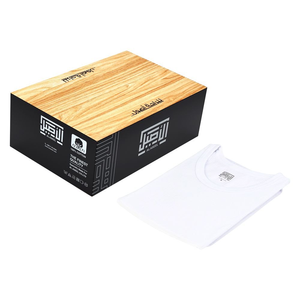 فنيلة الأصيل الداخلية للشباب بيضاء مصنوعة من قطن منسوج عالي الجودة. الفنيلة تأتي بكم قصير (نصف كم) وبياقة حول الرقبة دائرية من الإيلاستين الناعم. مثالية للبس تحت الثوب أو القميص ومريحة في اللبس المنزلي وعند النوم. تدوم جودتها لفترات طويلة وبعد غسلات عديدة. ولراحة أكبر، الفنيلة تأتي بدون خياطة في الخلف لملصق العلامة ولكن بطباعة ناعمة من غير أن تشعر بها.