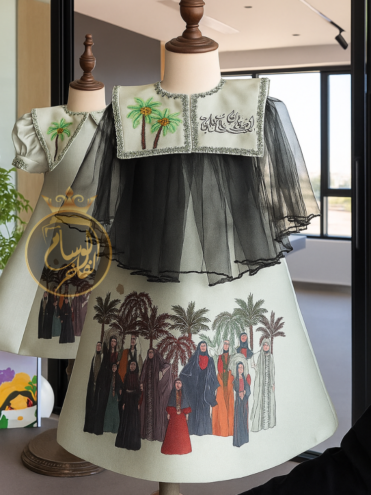 يتميز الفستان بلون هادئ أنيق مزدان بلمسات فنية راقية، حيث يزين الصدر تطريز يدوي لنخيلتين مع عبارة "هي لنا دار" بخط عربي أنيق، محاطة بإطار زخرفي يزيد من فخامته.