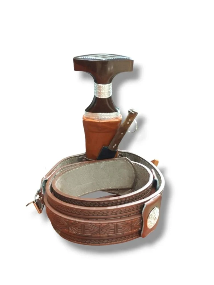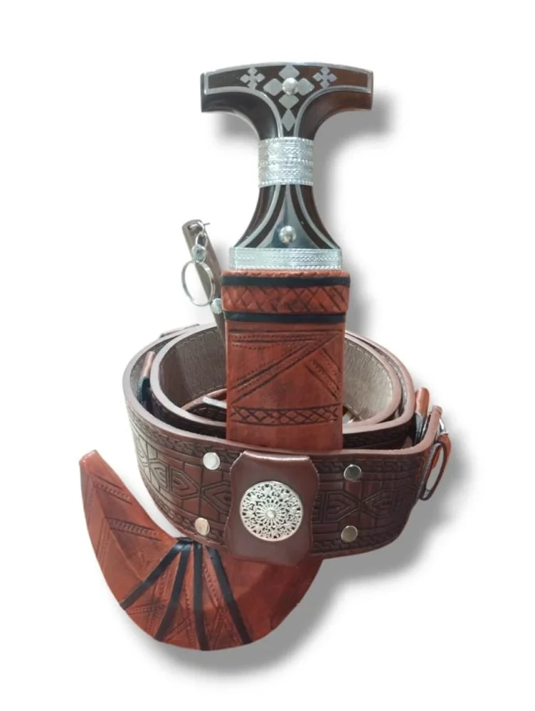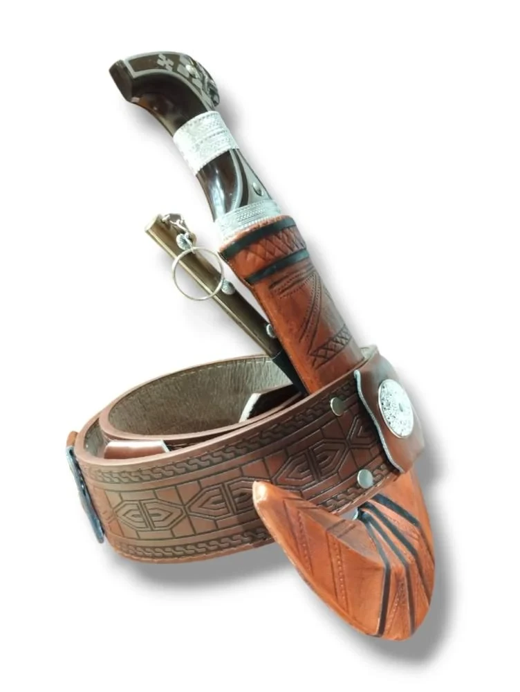 جنبية نجرانية فخمة، مقبضها بني منقوش بفضيات تسرّ الناظر، وغمدها جلد بني فاتح بزخارف تراثية، وحزام جلد منقوش مع مربط فضي يرفع الراس. منحنيتها على الطراز الجنوبي الأصيل، لابسينها للزوم الفخر والزينة في المناسبات والأعراس.