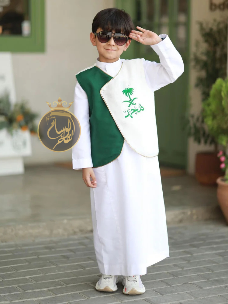 احصلي الان علي سديري وطني بتصميم ملكي مميز باللون الاخضر والابيض مطعم باطار ذهبي , مصنوع من أجود أنواع الأقمشة ليناسب طفلك وليبدو أنيق بطلته الجميلة في اليوم الوطني بشكل السديري الجذاب المطبوع عليه شعار او المطرز بعبارة أو بإسم طفلك .