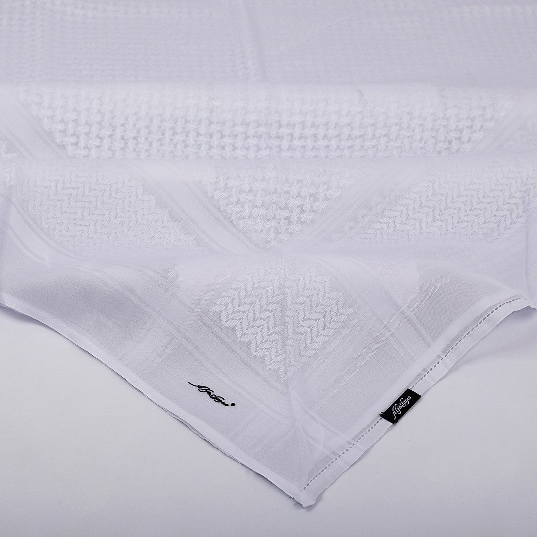 شماغ أبيض بخط زاهي وأنيق و أنماط خاصة و متفردة في مظهره ودقة في الألوان وثبات واضح وتطابق بالأطراف، صمم بمواصفات وجودة عالية