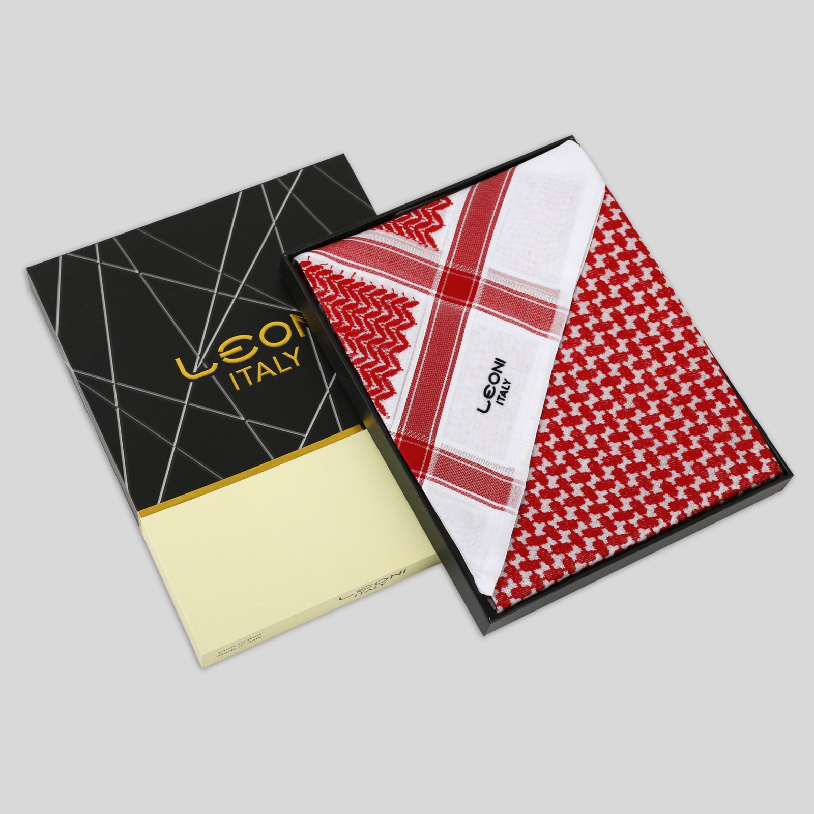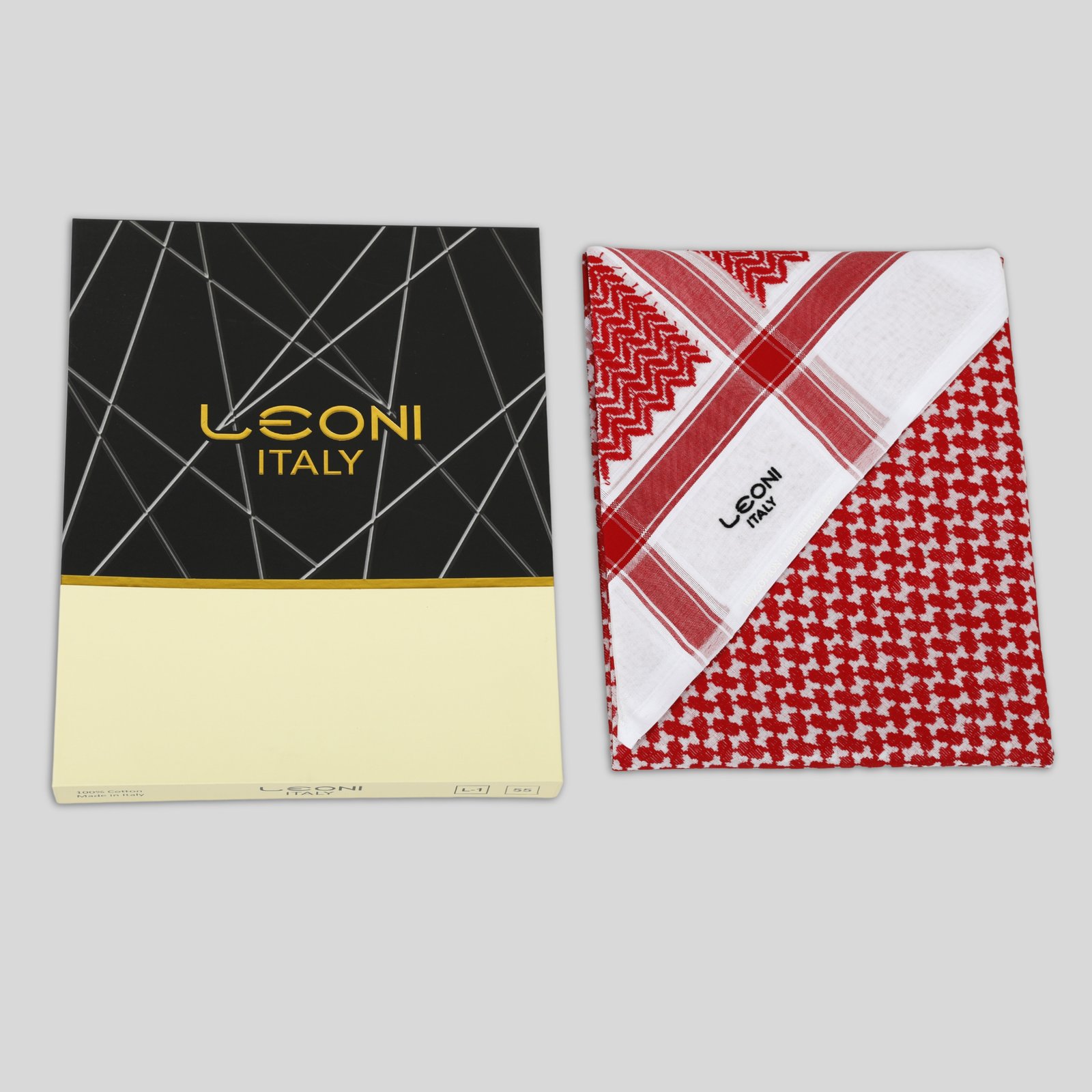 شماغ ليوني أحمر غامق ،مصنوع من 100% قطن نقي ليضمن لك الراحة والنعومة. صُنع بعناية فائقة في إيطاليا لتوفير أعلى درجات الجودة والتميز. يتميز بثبات اللون، نسيج مريح، وحياكة متقنة تعكس الفخامة والتقاليد الأصيلة. خيار مثالي لإطلالة أنيقة.