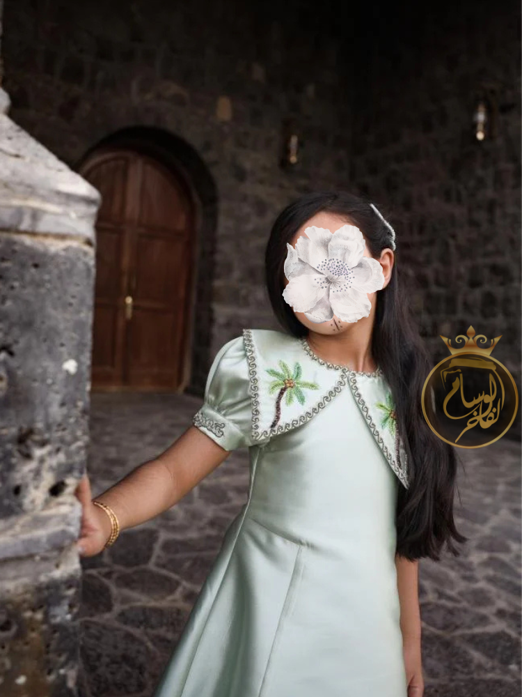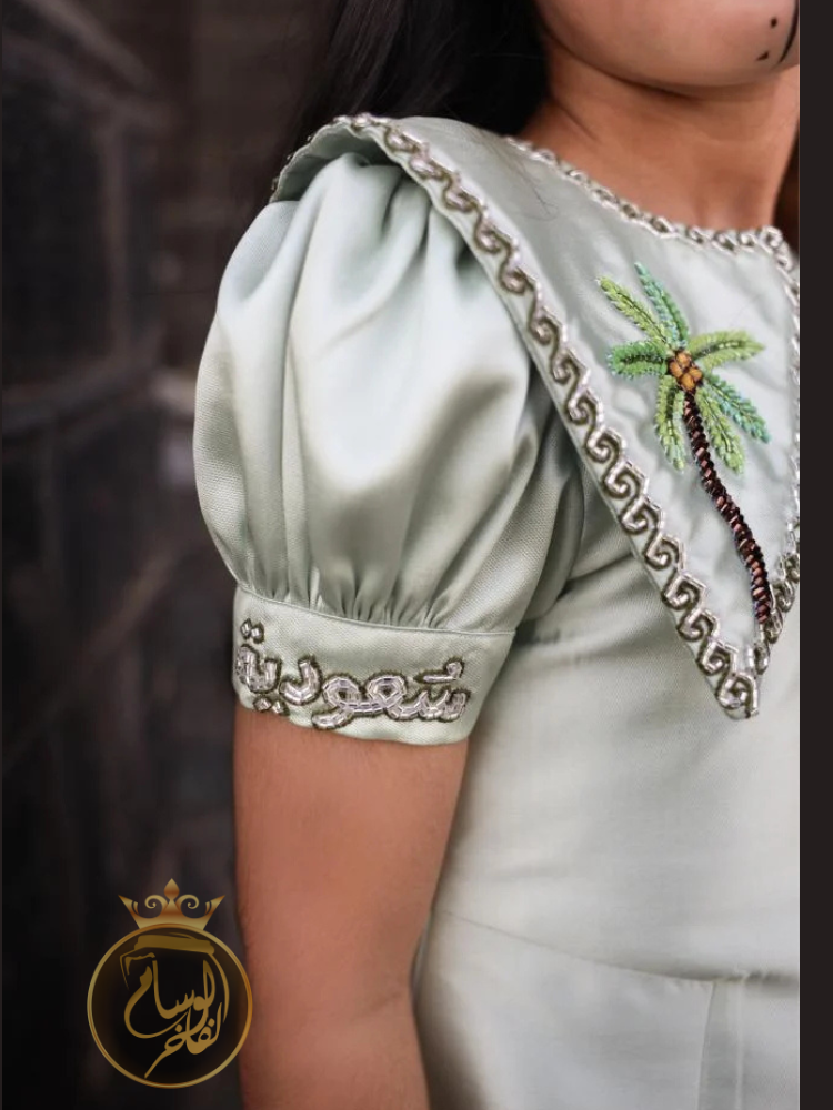 يتميز الفستان بلون هادئ أنيق مزدان بلمسات فنية راقية، حيث يزين الصدر تطريز يدوي لنخيلتين مع عبارة "هي لنا دار" بخط عربي أنيق، محاطة بإطار زخرفي يزيد من فخامته.