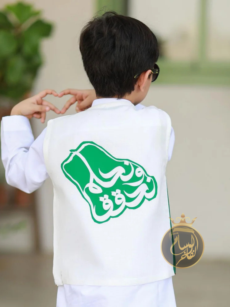 احصلي الان علي سديري وطني بتصميم ملكي مميز باللون الاخضر والابيض مطعم باطار ذهبي , مصنوع من أجود أنواع الأقمشة ليناسب طفلك وليبدو أنيق بطلته الجميلة في اليوم الوطني بشكل السديري الجذاب المطبوع عليه شعار او المطرز بعبارة أو بإسم طفلك .