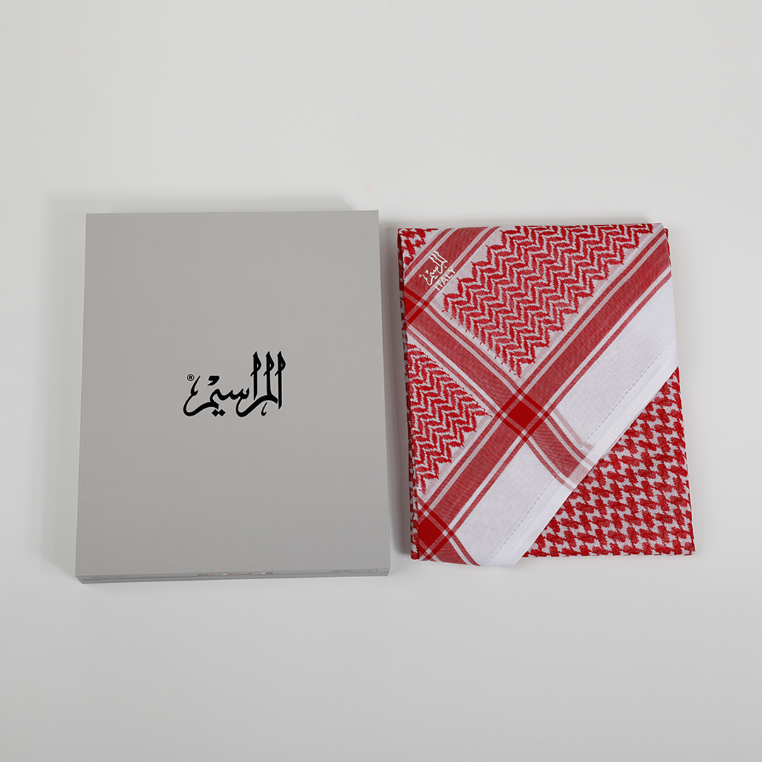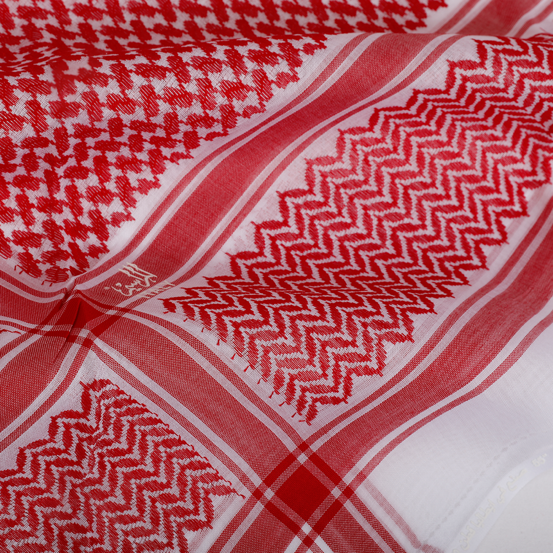 شماغ أحمر المراسيم أنماط خاصة ومتفردة في مظهرها ودقة في الألوان وثبات واضح و الذي تم صناعته وفق أعلى مقاييس الجودة للصناعة.