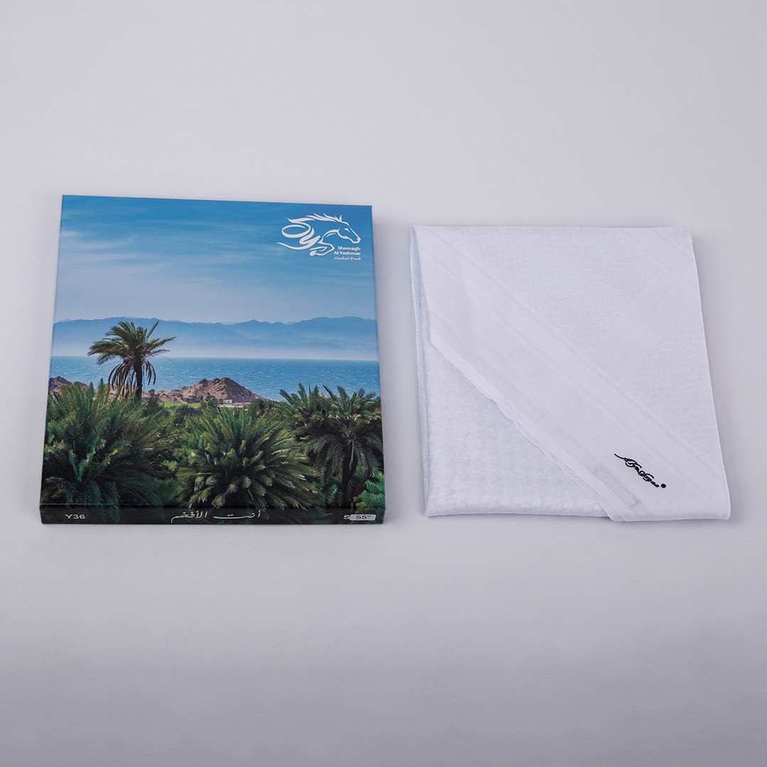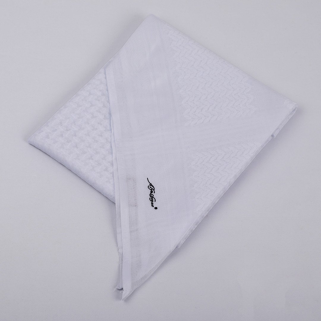 شماغ أبيض بخط زاهي وأنيق و أنماط خاصة و متفردة في مظهره ودقة في الألوان وثبات واضح وتطابق بالأطراف، صمم بمواصفات وجودة عالية