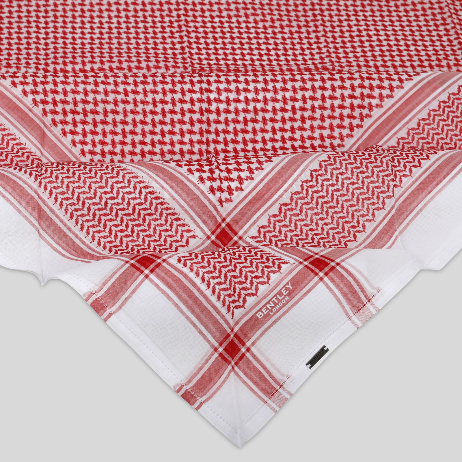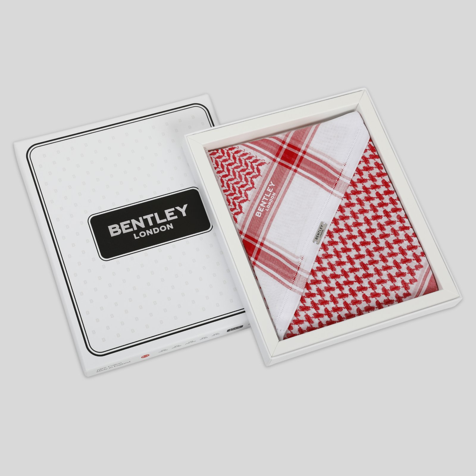- الاسم مكتوب بتباين و انسجام مع الشماغ باللون الأبيض و علامة معدنية مطبوع عليها ماركة BENTLEY.