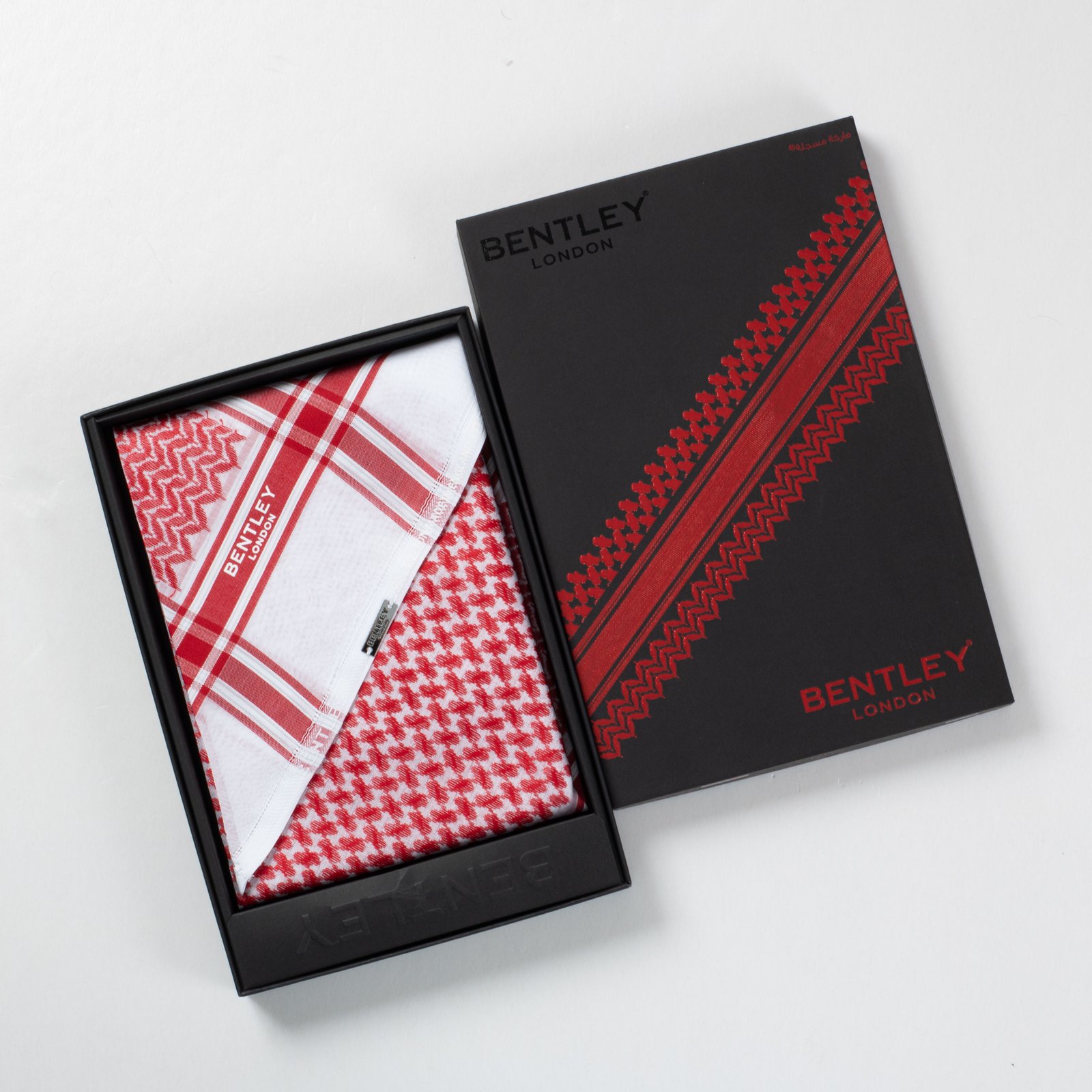 - الاسم مكتوب بتباين و انسجام مع الشماغ باللون الأبيض و علامة معدنية مطبوع عليها ماركة BENTLEY.