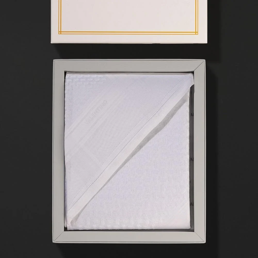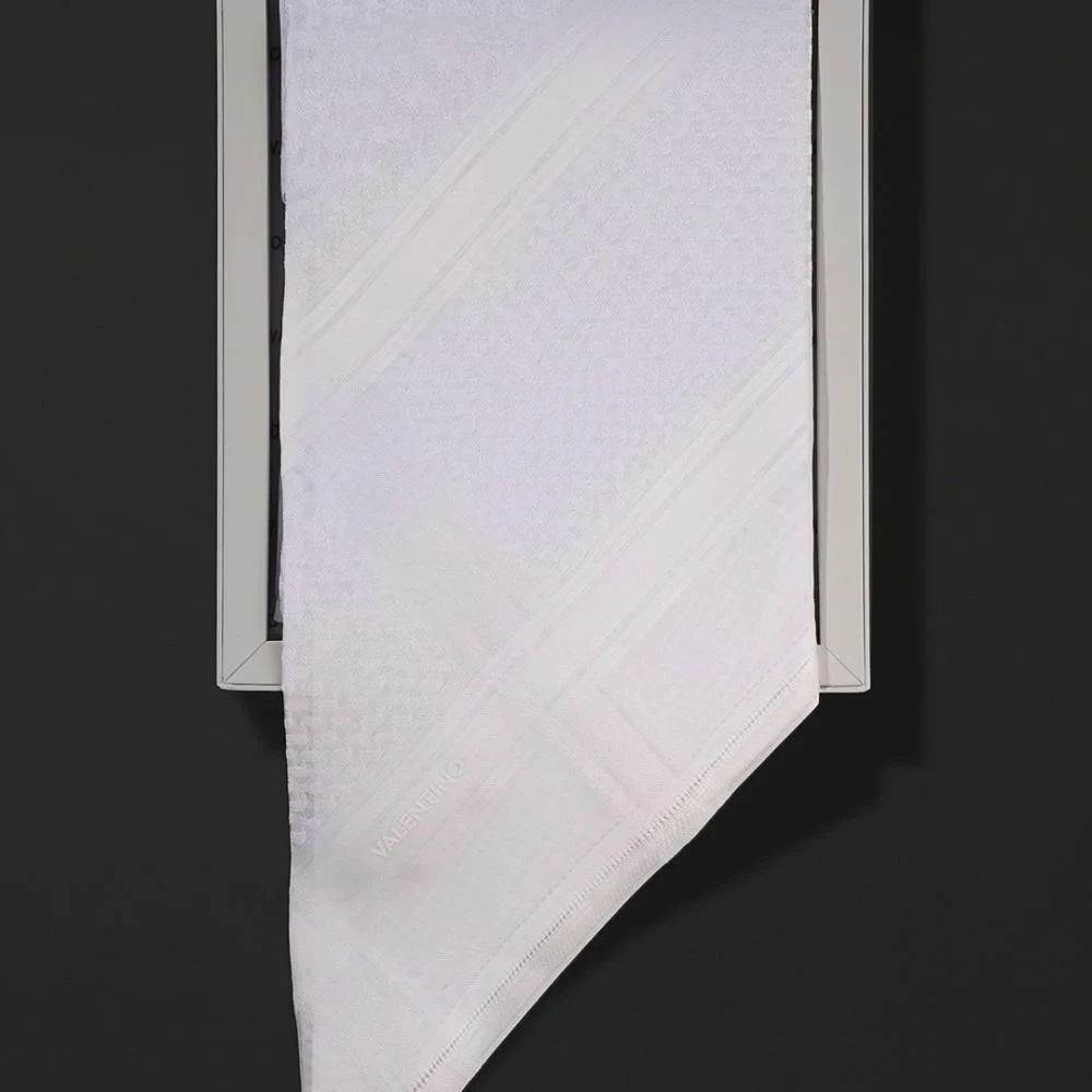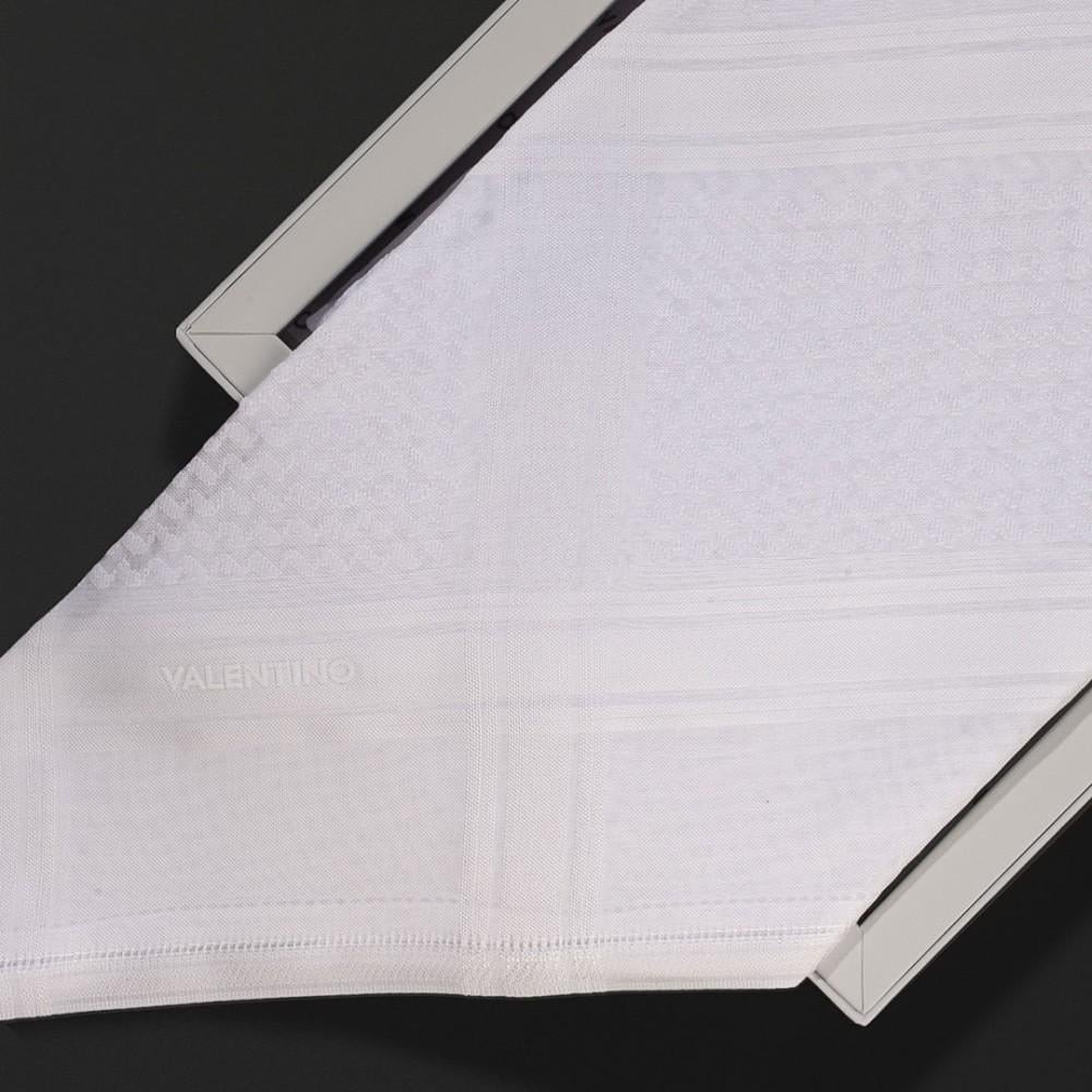 شماغ فالنتينو ابيض  والذي يأتي بخيوط من القطن الصافي والتي تم نسجها وحياكتها بالكامل على أيدي ايطالية، يتميز الشماغ بنقشة مميزة وبتصميم فريد من نوعه يعطي طابع الثقة بالنفس شماغ فالنتينو الأبيض الذي يجسد الماضي والحاضر ويعطي الاطلالة التي تبحث عنها، تم صناعتة وحياكة الشماغ بالكامل في ايطاليا.