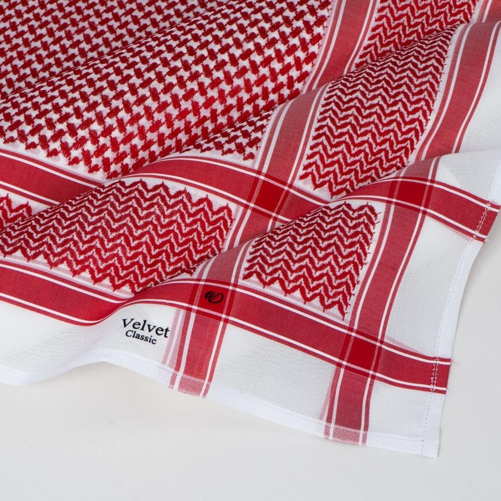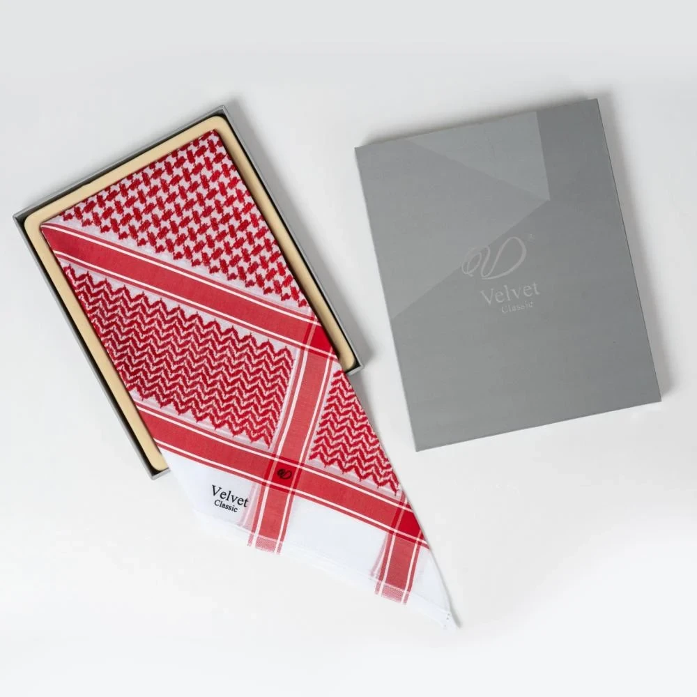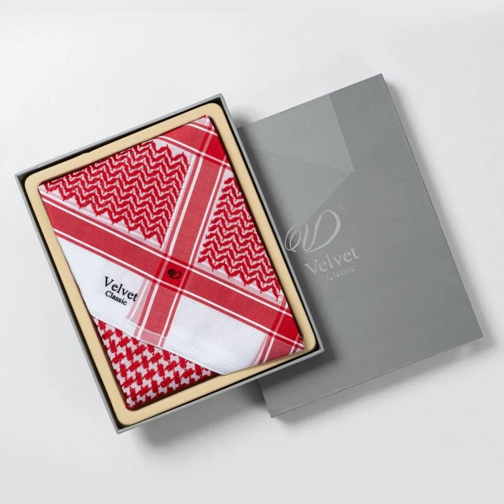 شماغ فيلفت كلاسيك احمر انجليزي يعد من الاشمغة المميزة جداً التي تجمع بين الشكل التقليدي الاصيل للشماغ والهوية الخليجية العربية العصرية والموضة الحديثة حيث الاناقة والنعومة والدقة في التصميم يحتل المرتبة الاولى على مستوى العالم وفي بيوت الازياء العالمية تصميم مميز بأنماط خاصة وفريدةدقة عالية في الألوان ثبات واضح على الرأس أطراف متطابقة مظهر أنيق