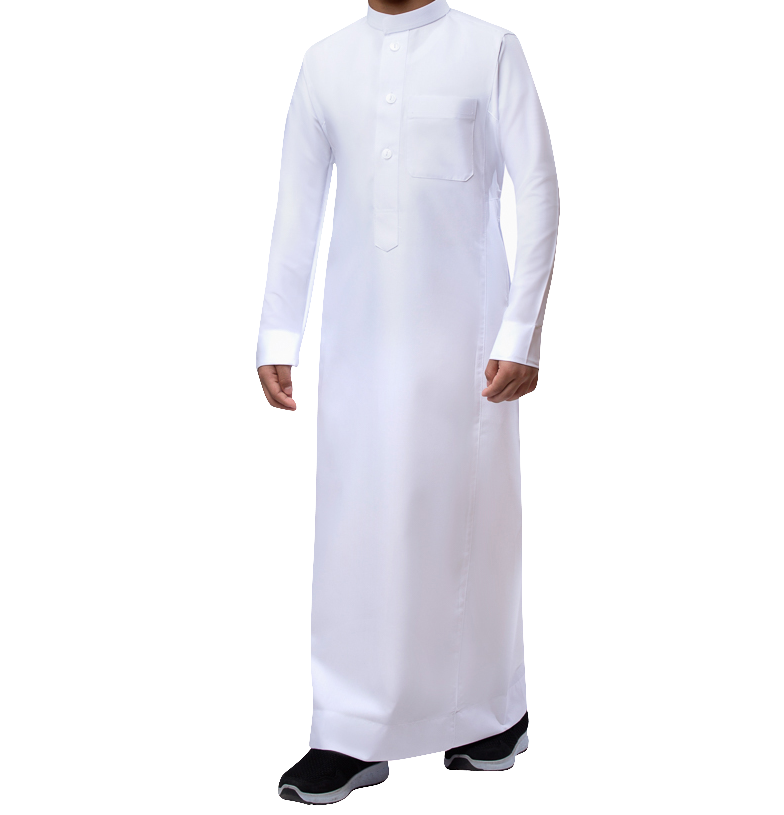 ثوب سعودي بأدق التفاصيل وأجود أنواع أقمشة الثياب، يأتي بمقاسات مدروسة بعناية ليمنح طفلك الثقة في الملبس والمظهر. الثوب يأتي بياقة منحنية مريحة وأزرار بلاستيكية بيضاء خفيفة صممت لتعطي راحة أكبر عند اللبس، بالإضافة إلى جيب واحد علوي واثنين على الجوانب. الثوب من قماش بوليستر وملمس قطني وأكمام سادة مفصل بجودة ودقة عالية نتجت عن خبرات طويلة تجاوزت الثلاثين عاماً في صناعة الثياب